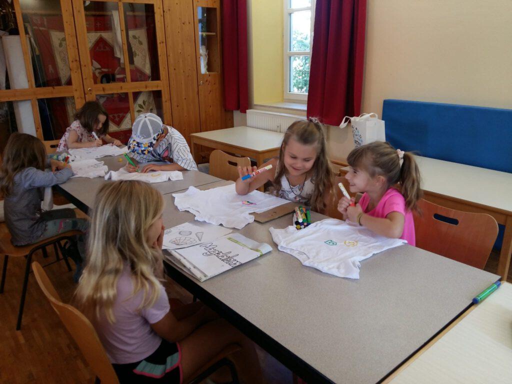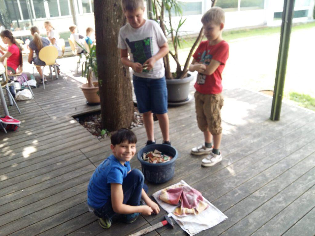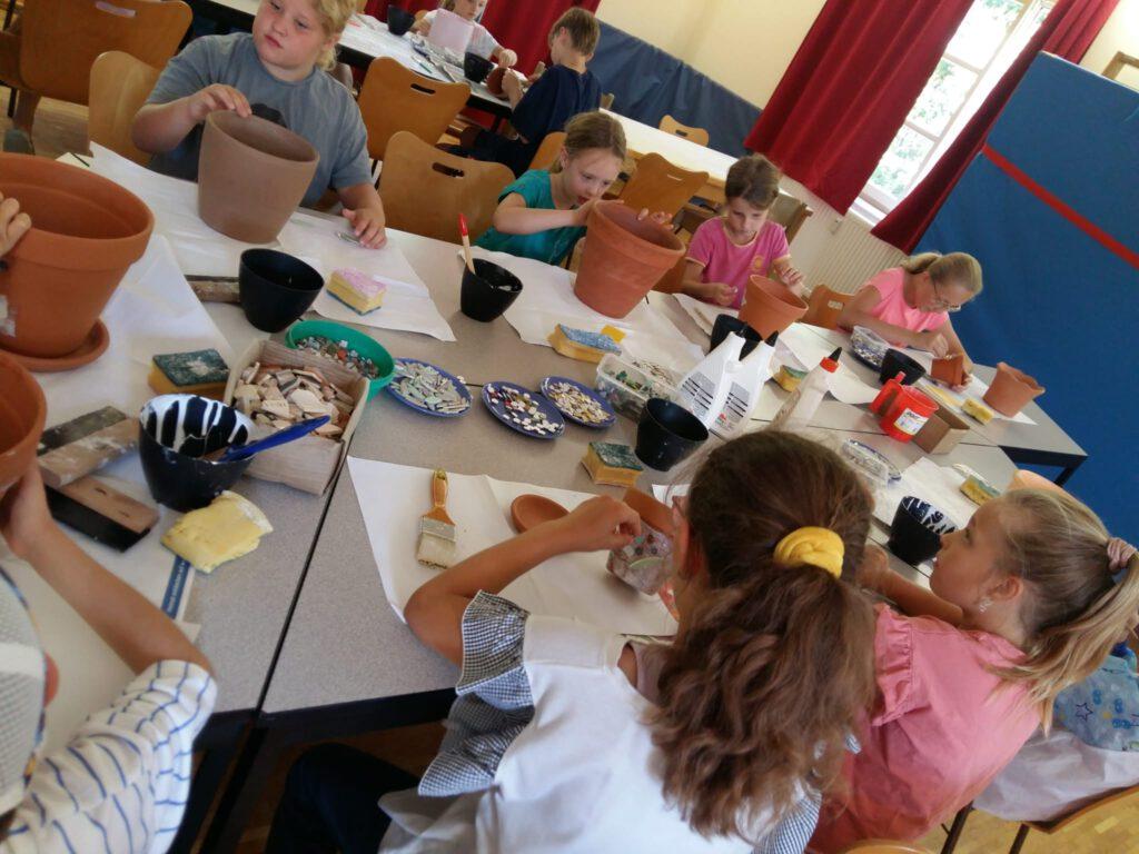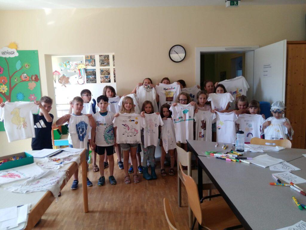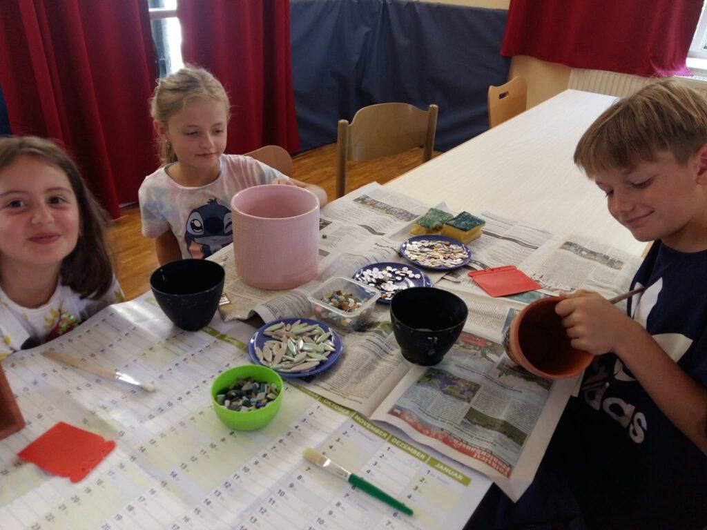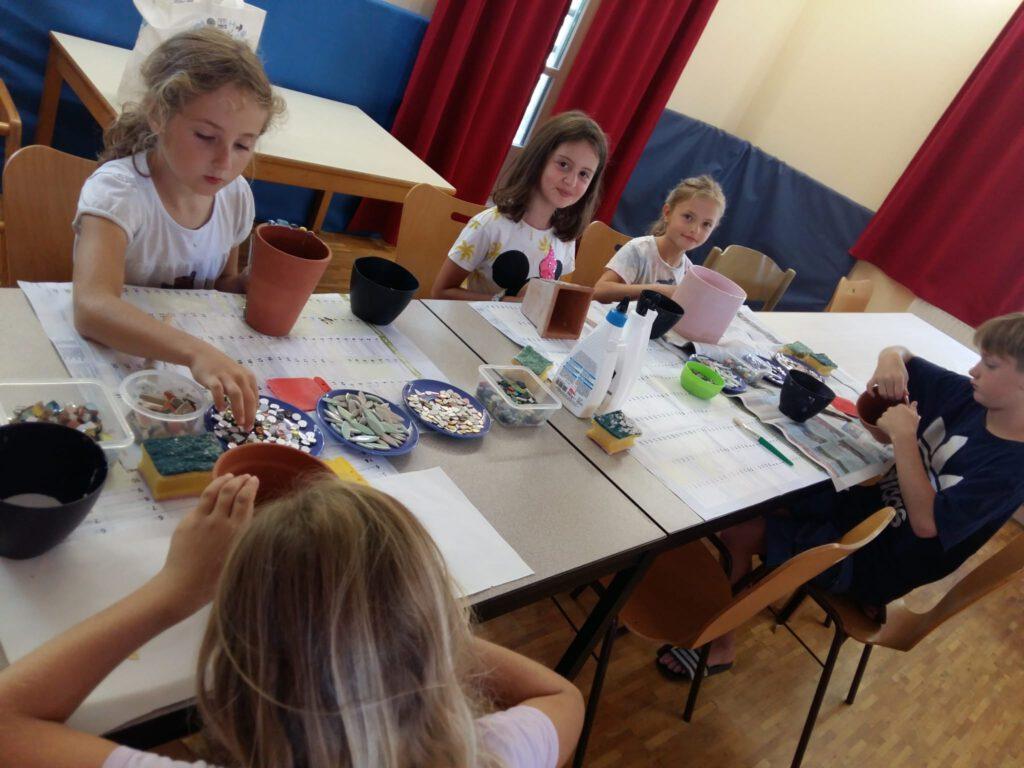 Der 1. Ferienprogrammtag begann am Mittwoch, 06.08.2025 in Eggenfelden vormittags mit T-Shirt bemalen. Die Kinder durften die weißen Oberteile mit verschiedenen Motiven und eigenem Namen verzieren. Am Nachmittag stand Mosaikbasteln auf dem Programm. Bei schönem Wetter konnten die selbstmitgebrachten Tontöpfe draußen gestaltet werden und die oftmals sehr großen Pflasterstücke wurden mit Hammer und Tuch auseinandergebrochen. Auch hier entstanden wunderbare Werke auf den Töpfen, die danach mit Fugenmasse ausgefüllt wurden.