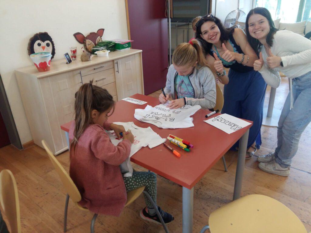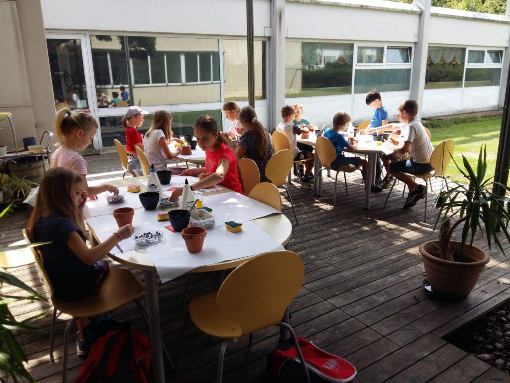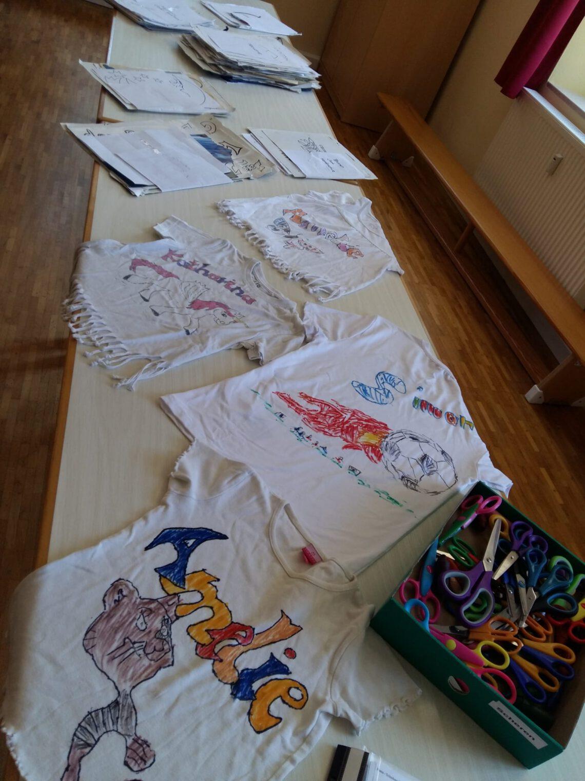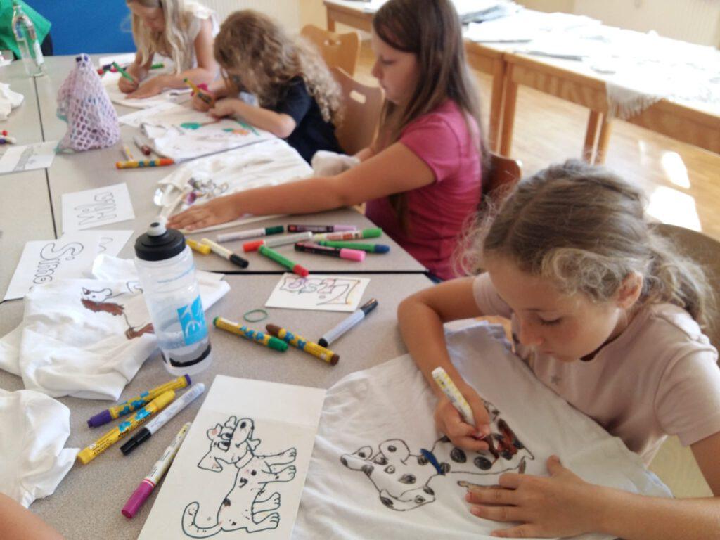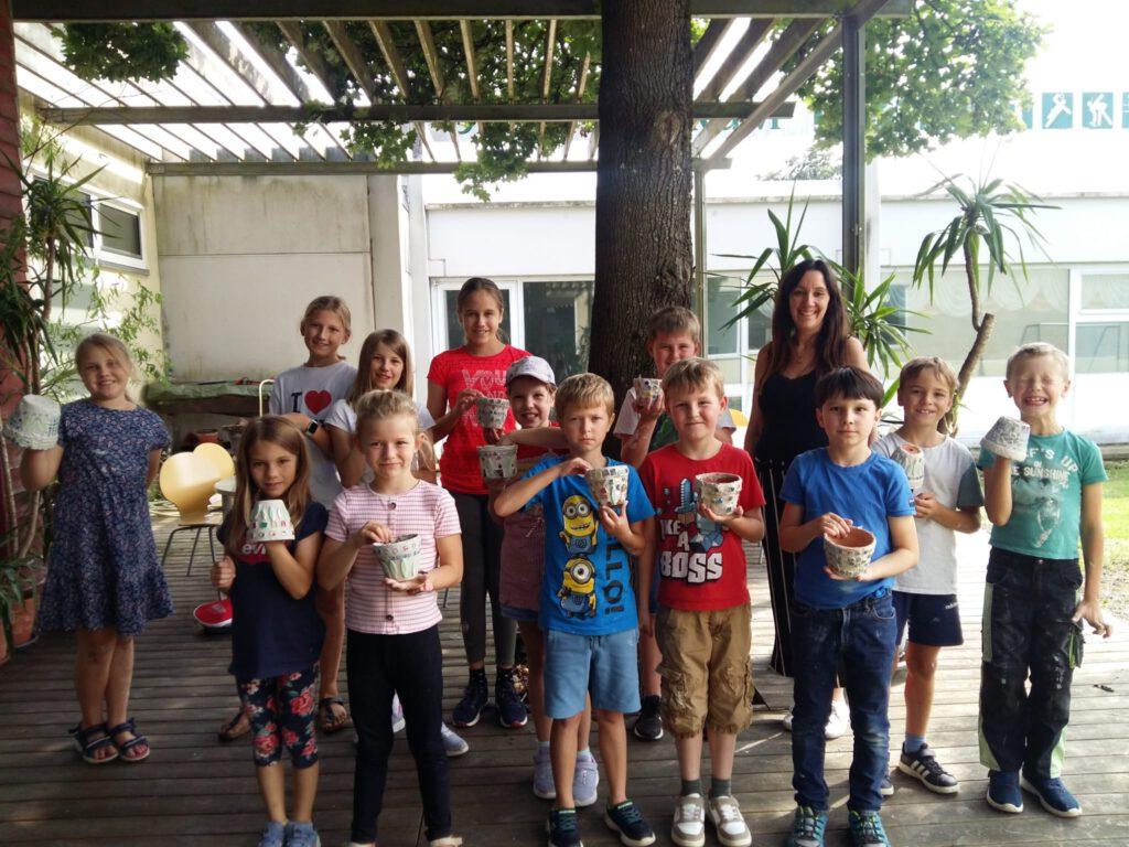Der 1. Ferienprogrammtag begann am Mittwoch, 06.08.2025 in Eggenfelden vormittags mit T-Shirt bemalen. Die Kinder durften die weißen Oberteile mit verschiedenen Motiven und eigenem Namen verzieren. Am Nachmittag stand Mosaikbasteln auf dem Programm. Bei schönem Wetter konnten die selbstmitgebrachten Tontöpfe draußen gestaltet werden und die oftmals sehr großen Pflasterstücke wurden mit Hammer und Tuch auseinandergebrochen. Auch hier entstanden wunderbare Werke auf den Töpfen, die danach mit Fugenmasse ausgefüllt wurden.