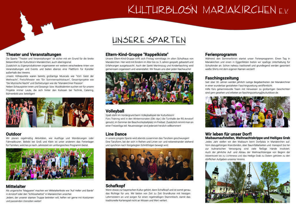 Die Kulturblos’n Mariakirchen bietet vielfältige Angebote, die zum Mitmachen einladen. Hier ein Überblick über unsere Sparten.